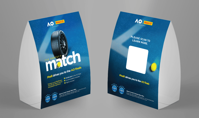 O key visual dinâmico une o pneu Pirelli e a bola de tênis, simbolizando a parceria perfeita entre performance e experiência. Foram criados materiais digitais e impressos, incluindo flyer promocional (A4), counter card e pull up banner, todos com destaque para os logos do Australian Open e Canstar Blue, reforçando a credibilidade e os valores da marca.
